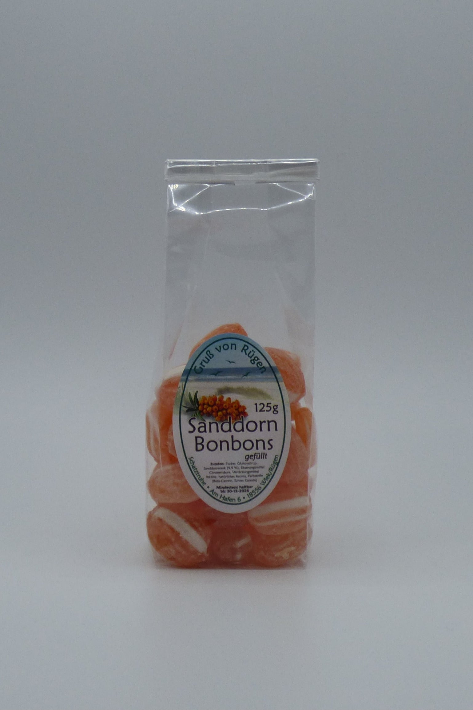 Zutaten: Zucker, Glukosesirup, Sanddornmark (9,9 %), Säurungsmittel Citronsäure, Verdickungsmittel Pektine, natürliches Aroma, Farbstoffe (Beta-Carotin, Echtes Karmin)