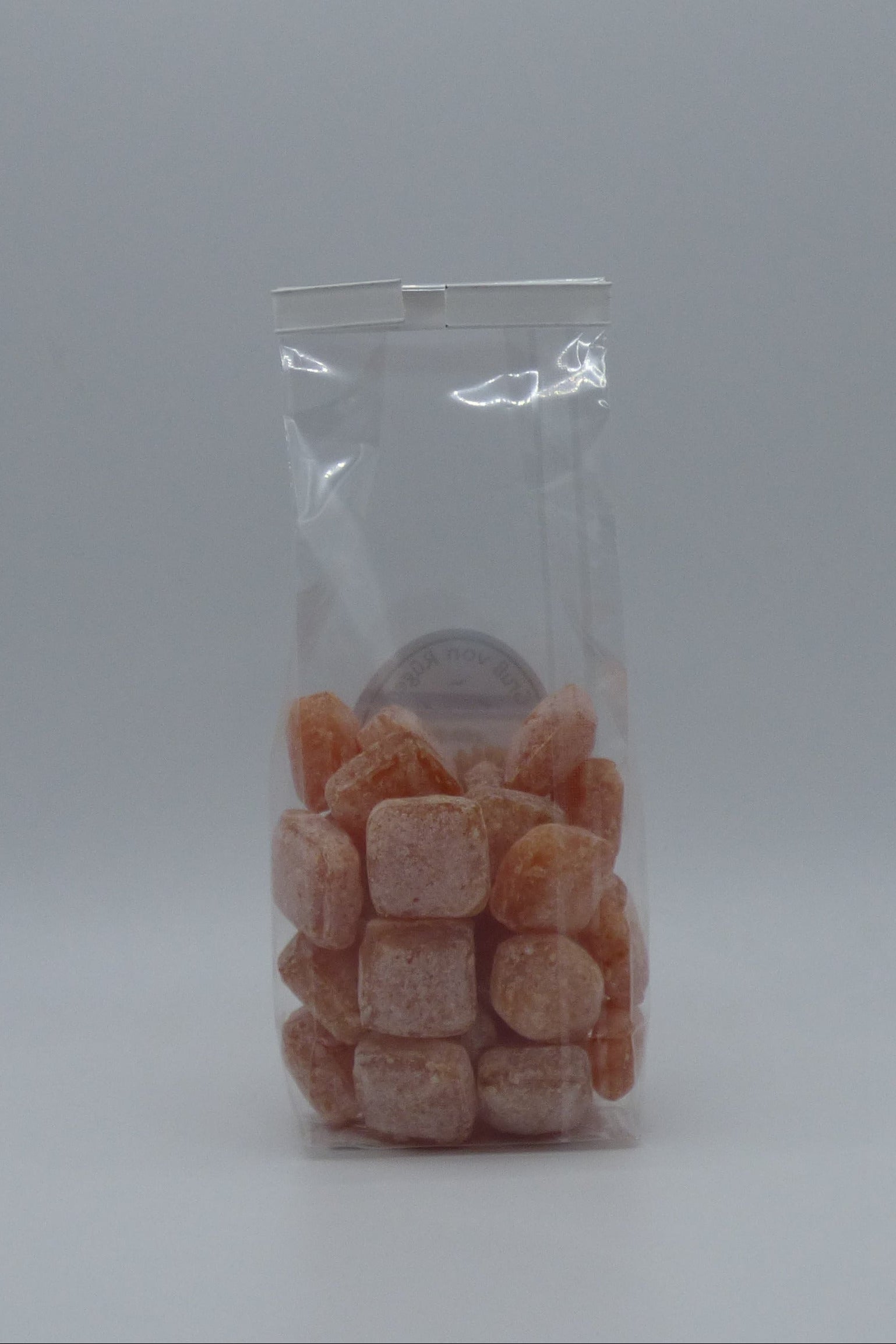 Zutaten: Zucker, Glukosesirup, Säurungsmittel Citronsäure, natürlicher Ingwerextrakt, natürliches Sanddorn-Aroma, natürlich färbender Pflanzenextrakt (Karotte)